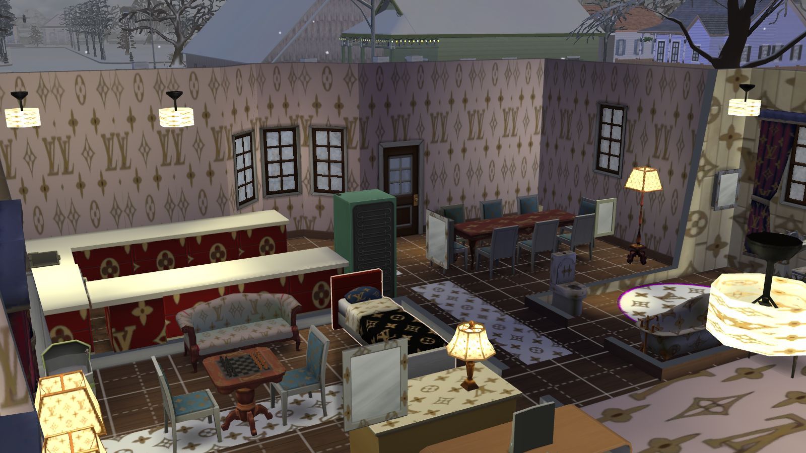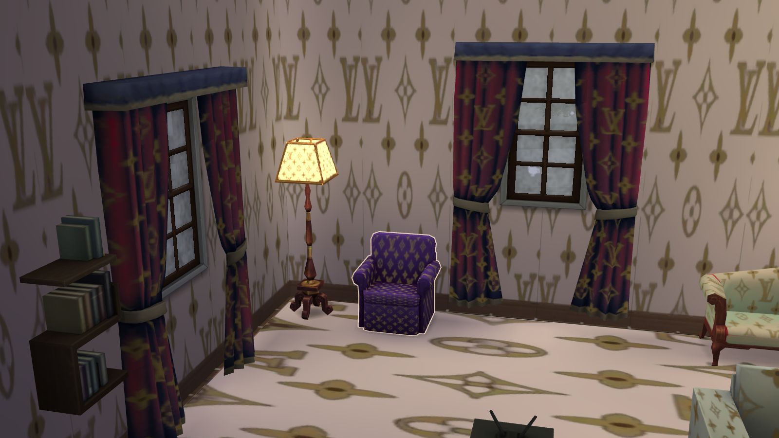 A Louis Vuitton set which comes with four wallpapers and a tile set, and also the Louis objects for around your home or wherever you would like to put them. The objects cover most rooms including items like Louis lampshades, sofas, mats, towels holders, drapes, beds, chester draws and some other around the house objects. Â